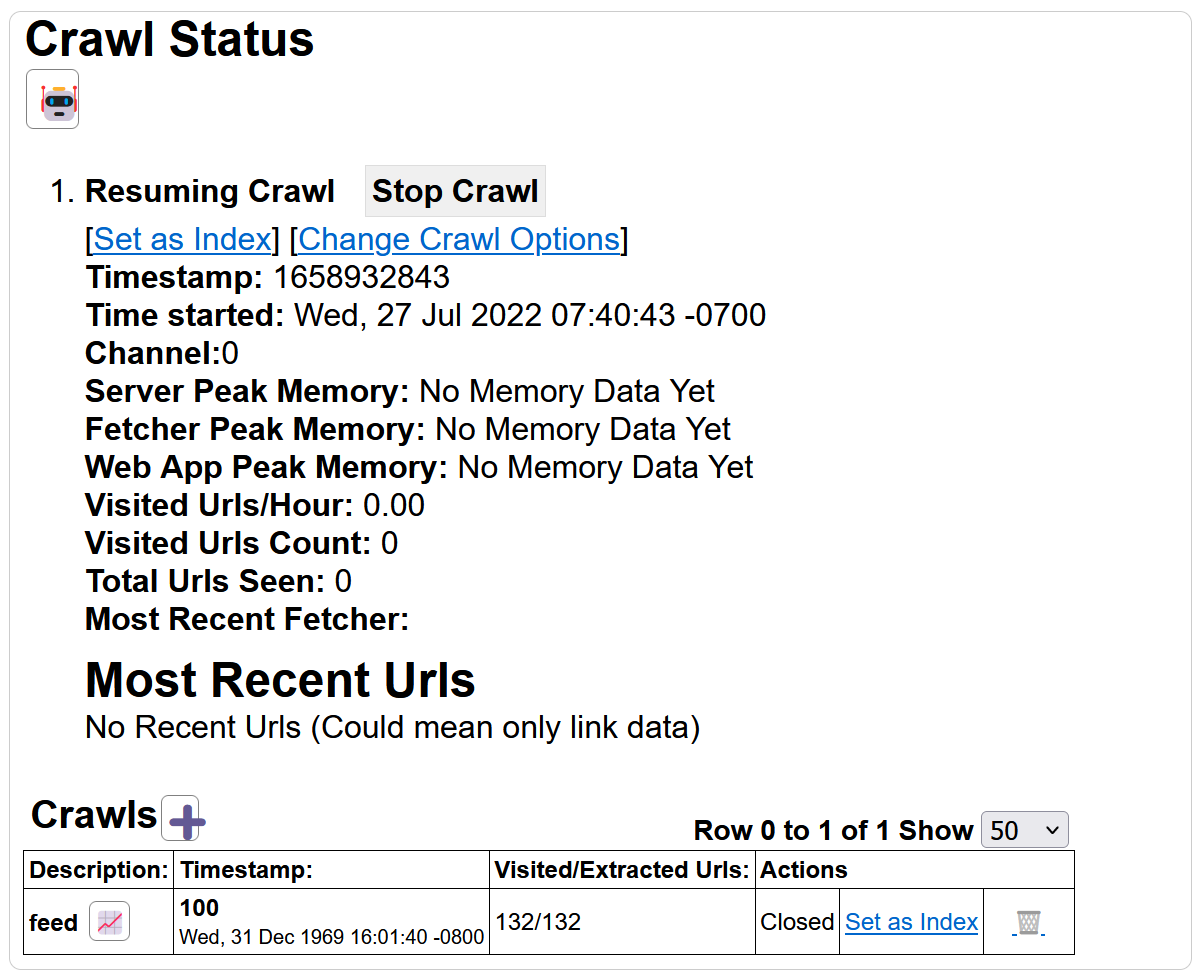 Yioop is dependent on curl, so as long as you have a modern copy of curl library installed, it should be HTTP/2 capable. I haven't added HTTP/3 support yet. You are starting your crawl from a http:// seed site, so if that page redirects to https:// you might get a redirect message. Again, that wouldn't explain why you are getting no search results. On the other hand, when I look at your page options, it looks like you have created a classifier that you are using to classify which web pages should be indexed. Did you try turning that off? Also, if you only check htm, html, it will only index web pages with that extension. So the page https://foo.com/ will not be indexed, because it does not have either extension, but https://foo.com/index.html would be indexed. The screening is done before any attempt at downloading the page, so at that point the mime type is not known. You can check unknown if you think it is okay to crawl https://foo.com/ . Also, I would tend to check at a minimum .txt as well.