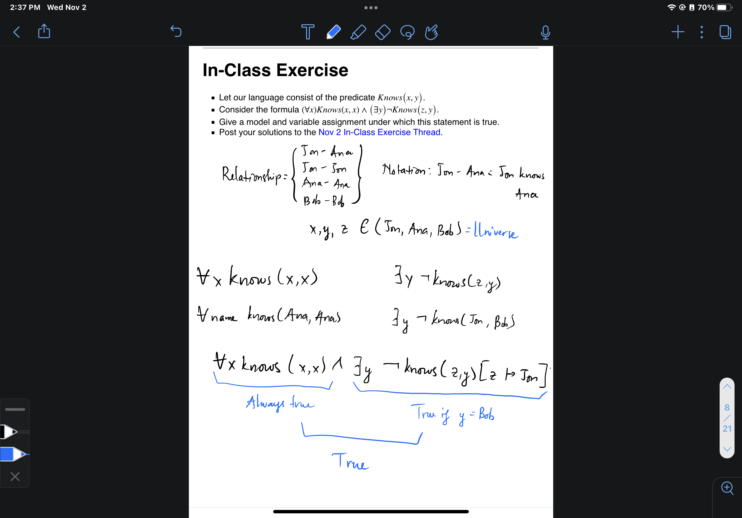 (Edited: 2022-11-02) (∀x)Knows(x,x) ∧ (∃y)¬Knows(z,y) Domain: (Alice, Bob, Cali) Knows: (Alice, Alice), (Bob, Bob), (Cali, Cali) Right side evaluates to true if we set it's variables to (Bob, Alice) or (Alice, Bob) or (Bob, Cali) or (Alice, Cali) or (Cali, Bob) or (Cali, Alice)