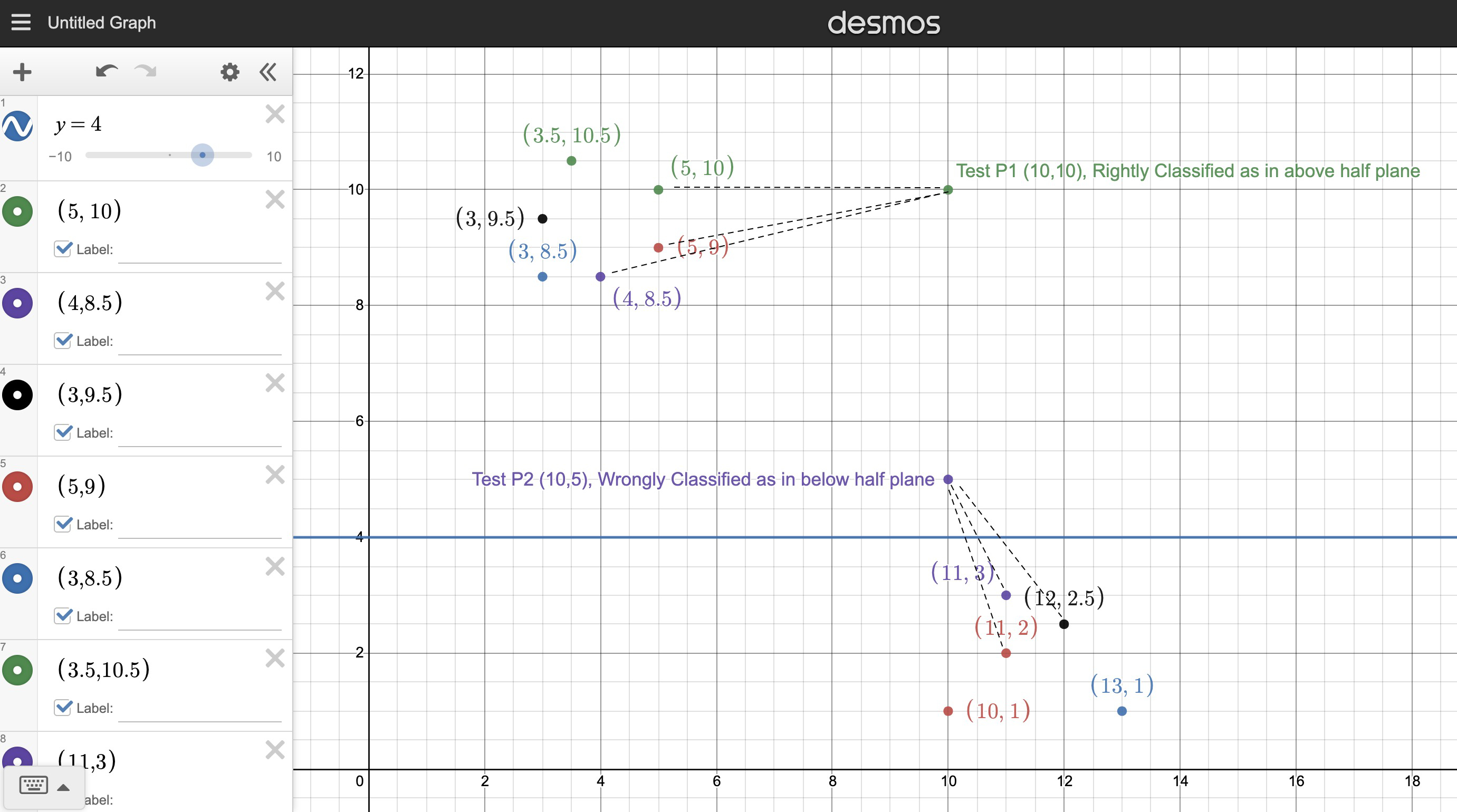 Point P2 will be classified as outside the half plane, (P2,0) since its closer to the points below the line y=4. This classification is wrong since it's above the line in reality and should be classified as (P2,1) .