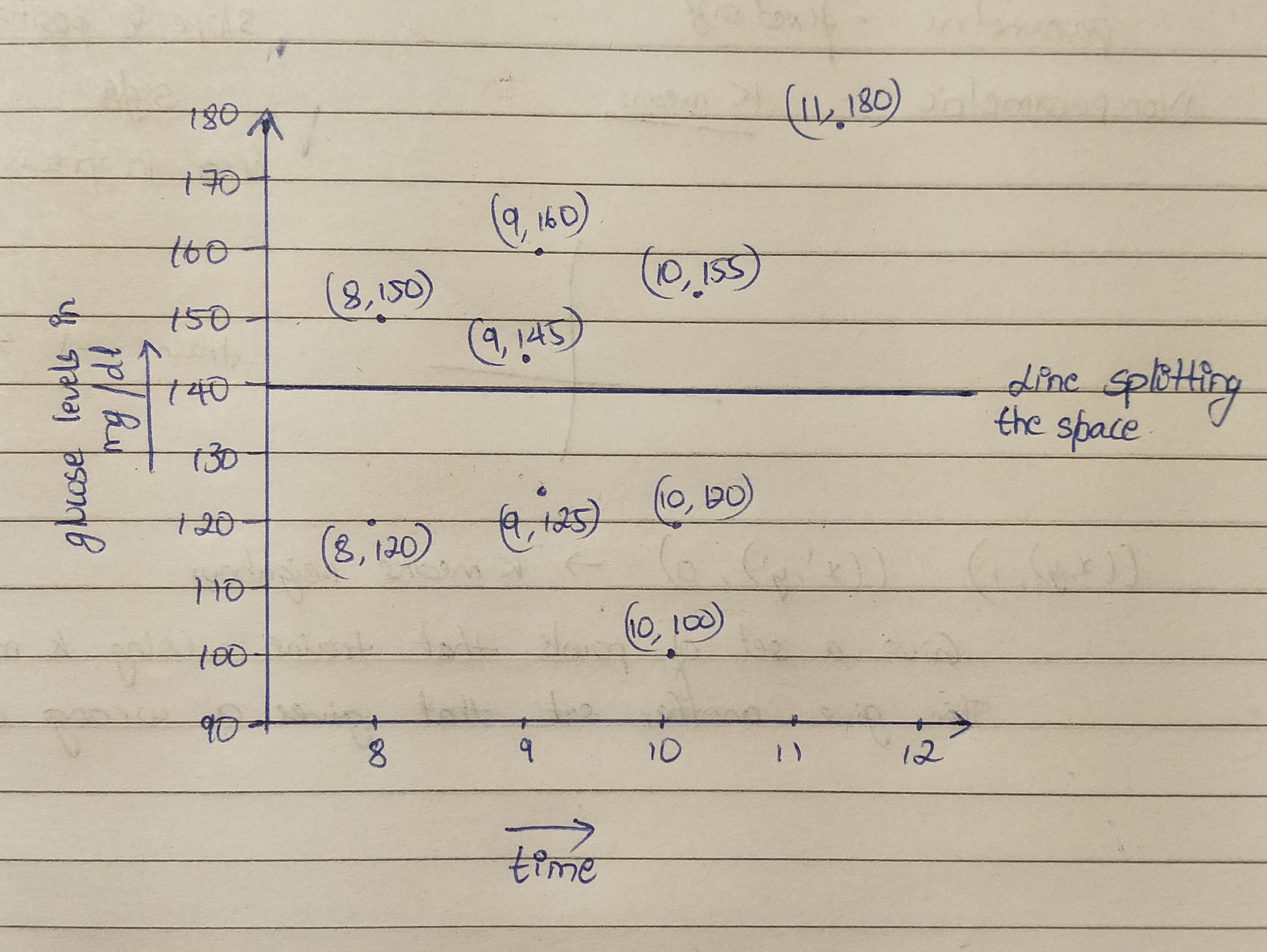 ((resource:IMG_20210829_200706.jpg|Resource Description for IMG_20210829_200706.jpg)) A non parametric way to train the space would be using KNN algorithm. Suppose for example we are training a basic model to predict the normal range of blood glucose levels plotted against time of the day. We can assume 0 means normal, 1 means above normal and the level of 140 is the line dividing the points into the spaces of normal and high ranges. We can use the following datasets to train the model : ((8,150),1),((9,160),1),((9,145),1),((10,155)1),((11,180)1), ((8,120)0),((9,125)0),((10,120)0),((10,100)0). Now with the model trained, if we use test using the data set ((10,180)), then the nearest neighbors would result in 1 predicting that the level is above normal range. This would be the condition where the model predicts the '''right answer'''. However, if we try using the data ((10,1000)) then again the model would predict it to be above the normal range, but in reality such a data set is practically impossible and hence the prediction would be '''incorrect'''. If we are using a parametric model to train this data set, then a lot of parameters would influence the model such as age of the person being tested, the food habits, time of last meal, etc. All these parameters would lead to errors due to their influence on the data and hence would compromise the final predictions of the model.