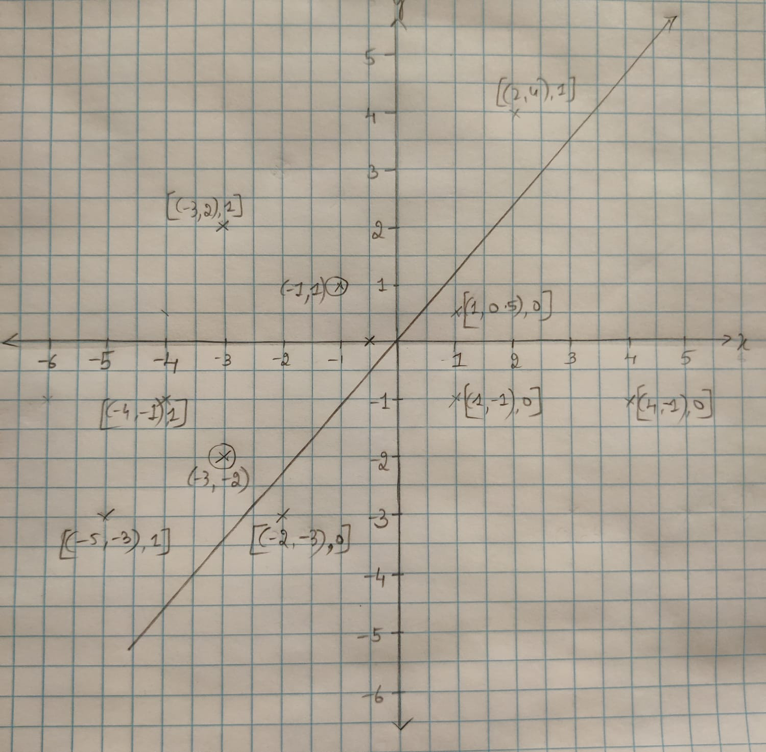 Assuming we are trying to learn the given half-space using the non-parametric approach of K Nearest Neighbor algorithm. A line passing through the origin separates the 2D half-space, with points above the line being represented as ((x,y), 1) and points below the line represented as ((x,y), 0) Let’s assume that k=3 i.e., to determine if a point falls above or below the line, we check its three nearest neighbors. Our test set consists of: Points (-3,2), (-4,-1), (-5, -3) and (2,4) fall above the line Points (-2, -3), (4,-1), (1,-1) and (1,0.5) fall below the line