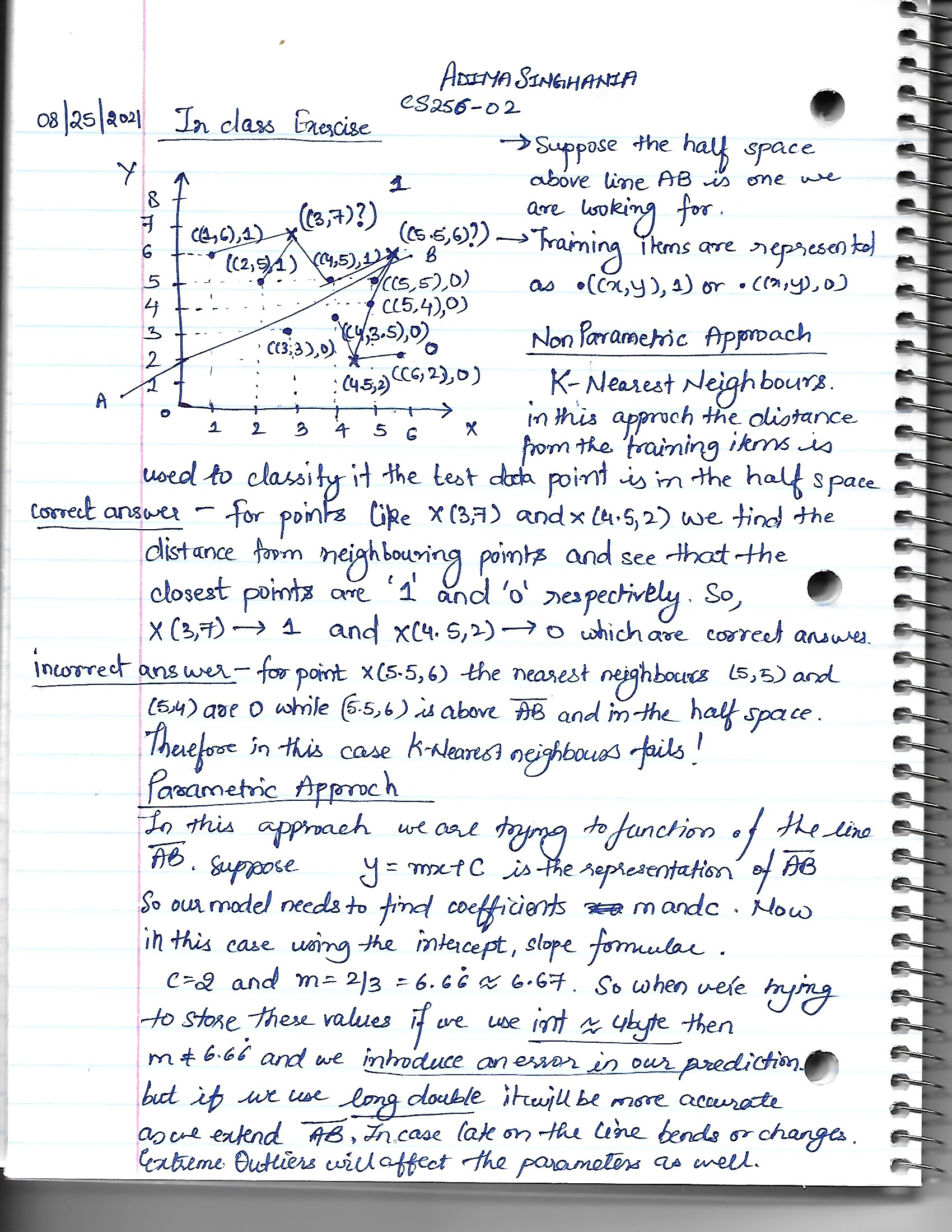 1. A non-parametric way that could be used is '''k nearest neighbors''' (example: k=3). A point could be determined if it is in the half space or not depending on its neighbors. I will be considering the line x=0 to determine the half space. All data points with y>0 would be in the half space and y<0 would not be in the half space. I am considering a small dataset with data points ((3,2),1) , ((4,5),1) , ((3,3),1) , ((4,4),1), ((1,-1),0), ((2,-1),0) , ((1,-2),0). 2. '''Case 1, correct answer:''' The data point (3,5) is closer to the cluster of points (3,2) , (4,5) , (3,3), (4,4) in the half space, therefore the knn algorithm will classify that point to be in the half space. '''Case 2, incorrect answer :''' The data point (1,1) is in the half space but closer to the data points not in the half space i.e., ((1,-1),(2,-1),(1,-2)), therefore it is incorrectly classified as not being in the half space by the knn algorithm. 3. When using a parametric model, parameters like slope of the line may result in errors for the model. As their precise values need to be stored in a variable, deciding the data type of that variable might affect the classification performance of the model. For example, storing the slope in an integer data type would have a different effect on classification when compared to storing it in a double data type.