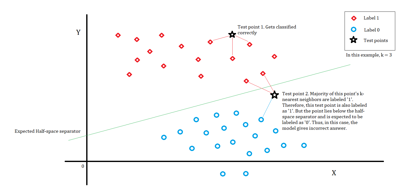 • Consider the following diagram. The diagram shows two types of points. The points having label 1 (red diamonds) are in the top part of the half-space, while the others (blue circles) are in the bottom part of the half-space. The green line is the correct separator of the two parts of the half-space. Our objective is to learn this separator. There are two test points (black stars). The first test point is tightly surrounded by alike labeled points and thus gets the correct label. On the other hand, for test point 2, although the point is below the separator the model incorrectly labels it as 1, because the majority of its k-nearest neighbors were labeled 1.