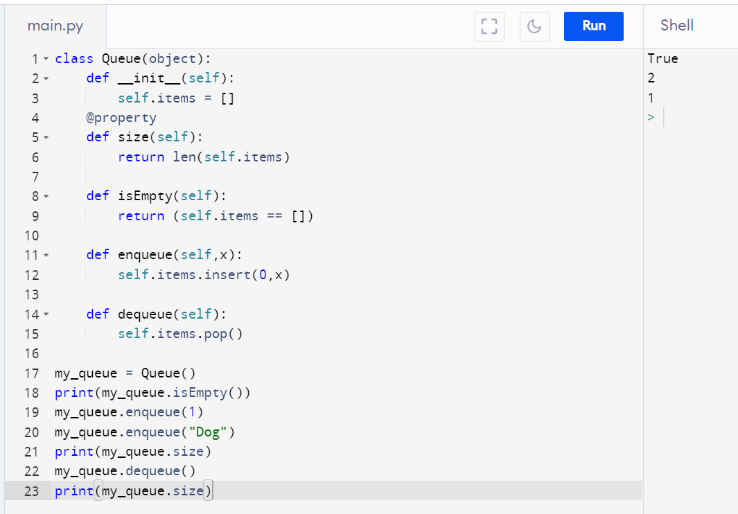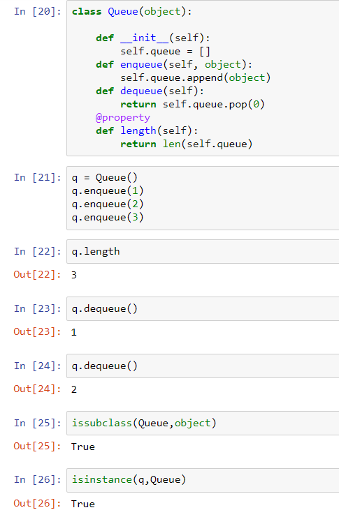 q.length # 3 q.dequeue()# 1 q.dequeue() # 2 issubclass(Queue,object) # True isinstance(q,Queue) # True
