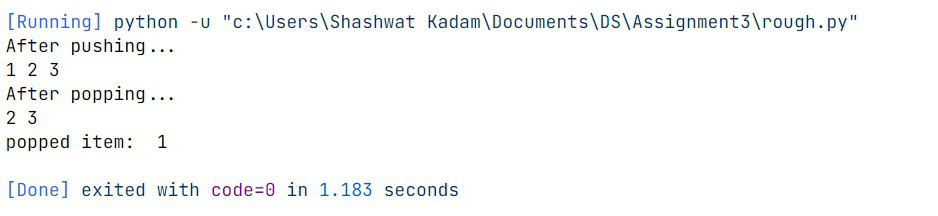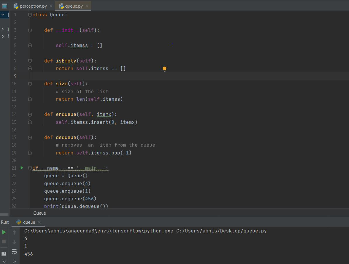 ((resource:fifio.JPG|Resource Description for fifio.JPG)) class Queue: def __init__(self): self.itemss = [] def isEmpty(self): return self.itemss == [] def size(self): # size of the list return len(self.itemss) def enqueue(self, itemx): self.itemss.insert(0, itemx) def dequeue(self): # removes an item from the queue return self.itemss.pop(-1) if __name__ == '__main__': queue = Queue() queue.enqueue(4) queue.enqueue(1) queue.enqueue(456) print(queue.dequeue()) print(queue.dequeue()) print(queue.dequeue()) After popping we get 4 then 1 then 456 in that FIFO.