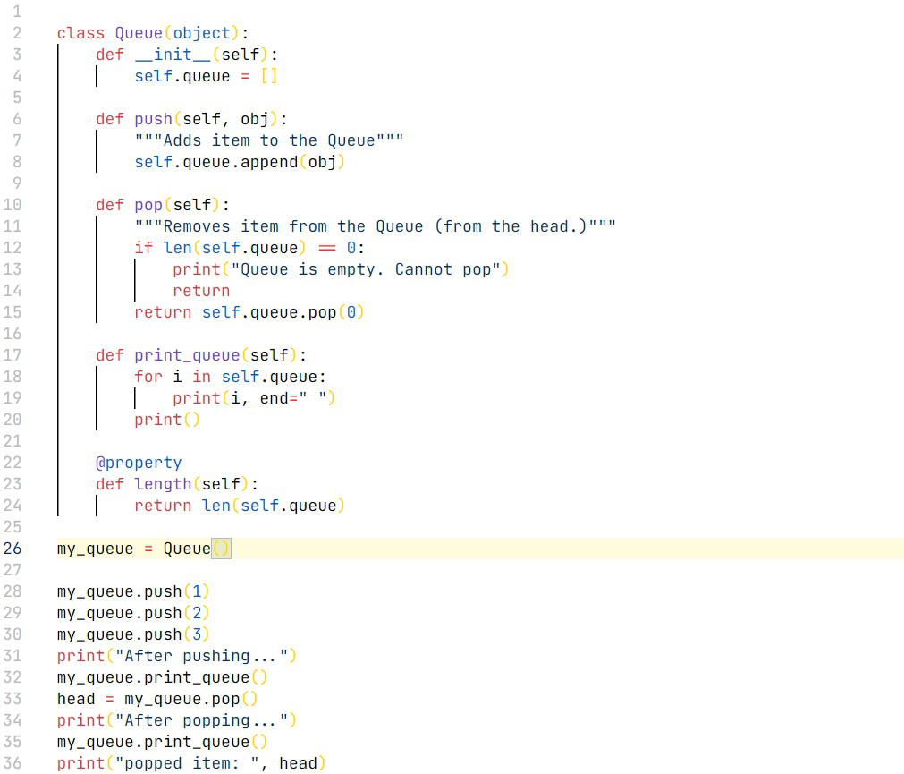 >>> class queue(object): def __init__(self): self.queue=[] def push(self, object): self.queue.append(object) def pop(self): return self.queue.pop(0) def length(self): return len(self.queue) >>> inst=queue() >>> inst.push("hey") >>> print(inst.length()) 1 >>> inst.push("hello") >>> print(inst.pop()) hey