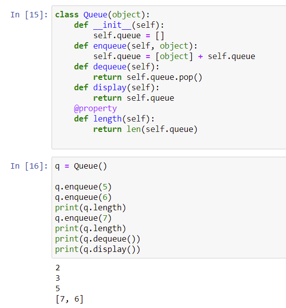 class Queue(object): def __init__(self): self.queue = [] def enqueue(self, object): self.queue.append(object) def dequeue(self): return self.queue.pop(0) @property def length(self): return len(self.queue) q = Queue() q.enqueue(1) q.enqueue(2) q.enqueue(3) q.length # 3 q.dequeue()# 1 q.dequeue() # 2 issubclass(Queue,object) # True isinstance(q,Queue) # True ((resource:queue.png|Resource Description for queue.png))