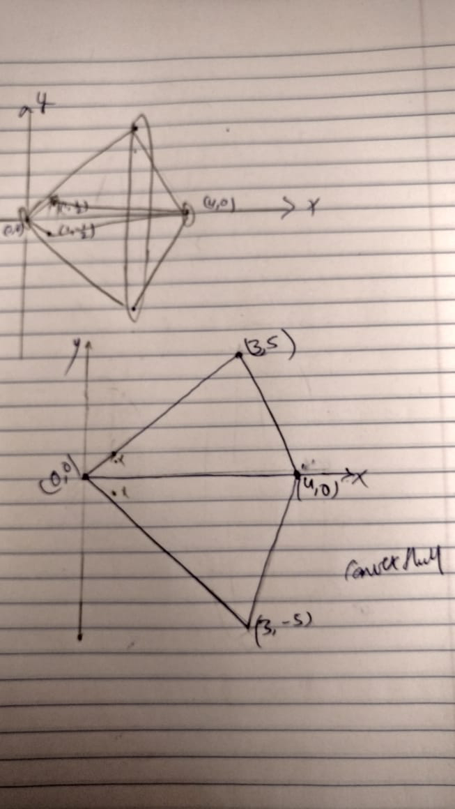 ((resource:WhatsApp Image 2021-09-25 at 9.33.01 PM.jpeg|Resource Description for WhatsApp Image 2021-09-25 at 9.33.01 PM.jpeg)) ((resource:WhatsApp Image 2021-09-25 at 9.33.19 PM.jpeg|Resource Description for WhatsApp Image 2021-09-25 at 9.33.19 PM.jpeg)) '''ALGORITHM''' 1. First mark all points (0,0),(1,12),(1,βˆ’12),(3,5),(3,βˆ’5),(4,0) on the plot. 2. Divide first half of the points on one side by drawing lines among them and the other half on the other side. 3. Now using cross products among points find the minimum and maximum value of Y coordinate and draw a convex hull using these new merged computations. '''Mainly- ''' As shown in the above diagram the cross product of points (0,0) and (3,5) give the highest value for Y and therefore is chosen, and the cross product of points (0,0) and (3,-5) gives the minimum value of Y therefore, it is chosen. Together these computations converge to form a Convex Hull.
