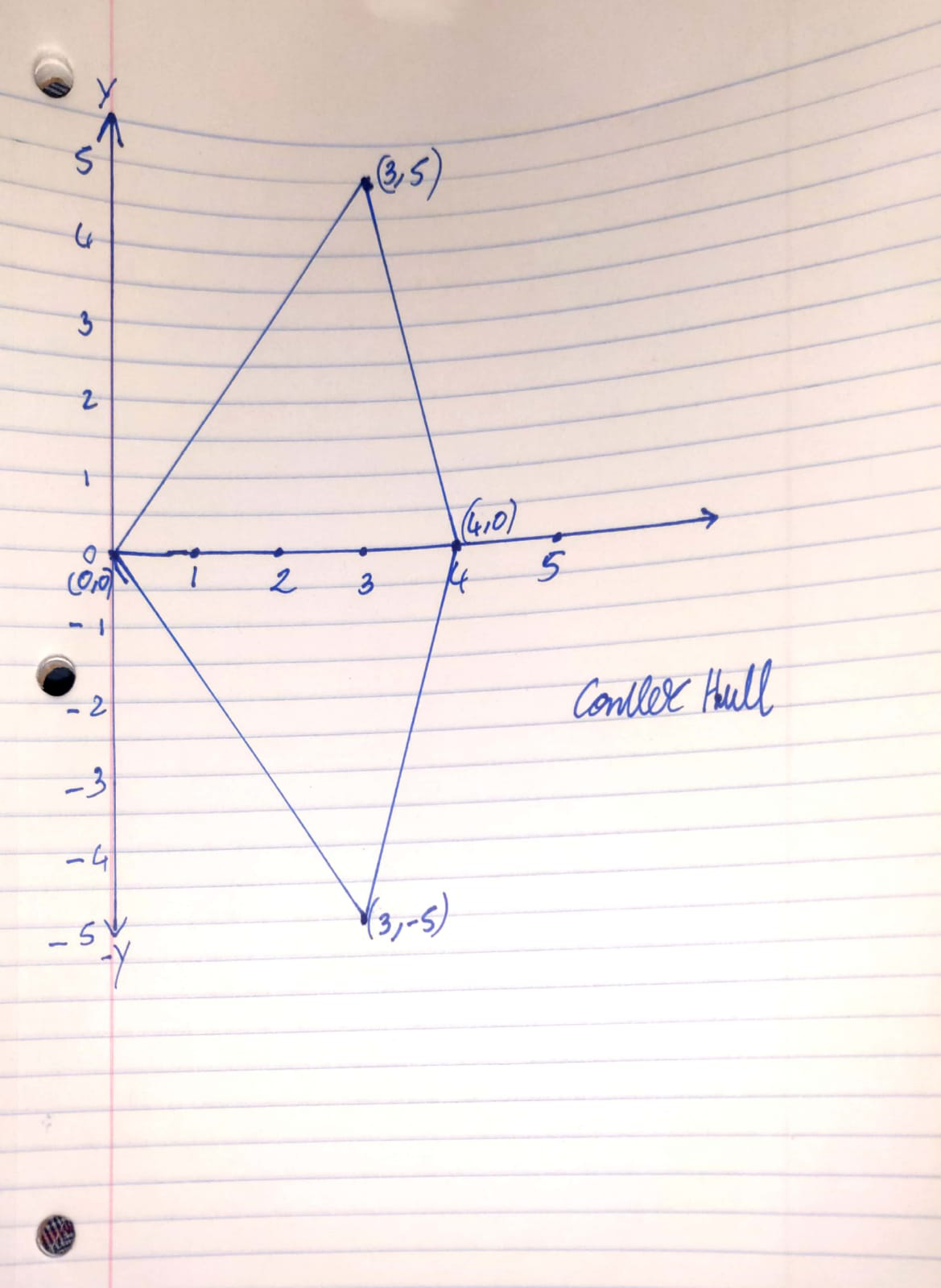 Finally, our convex hull for this set would be (0, 0), (3, 5), (3, -5), (4, 0)