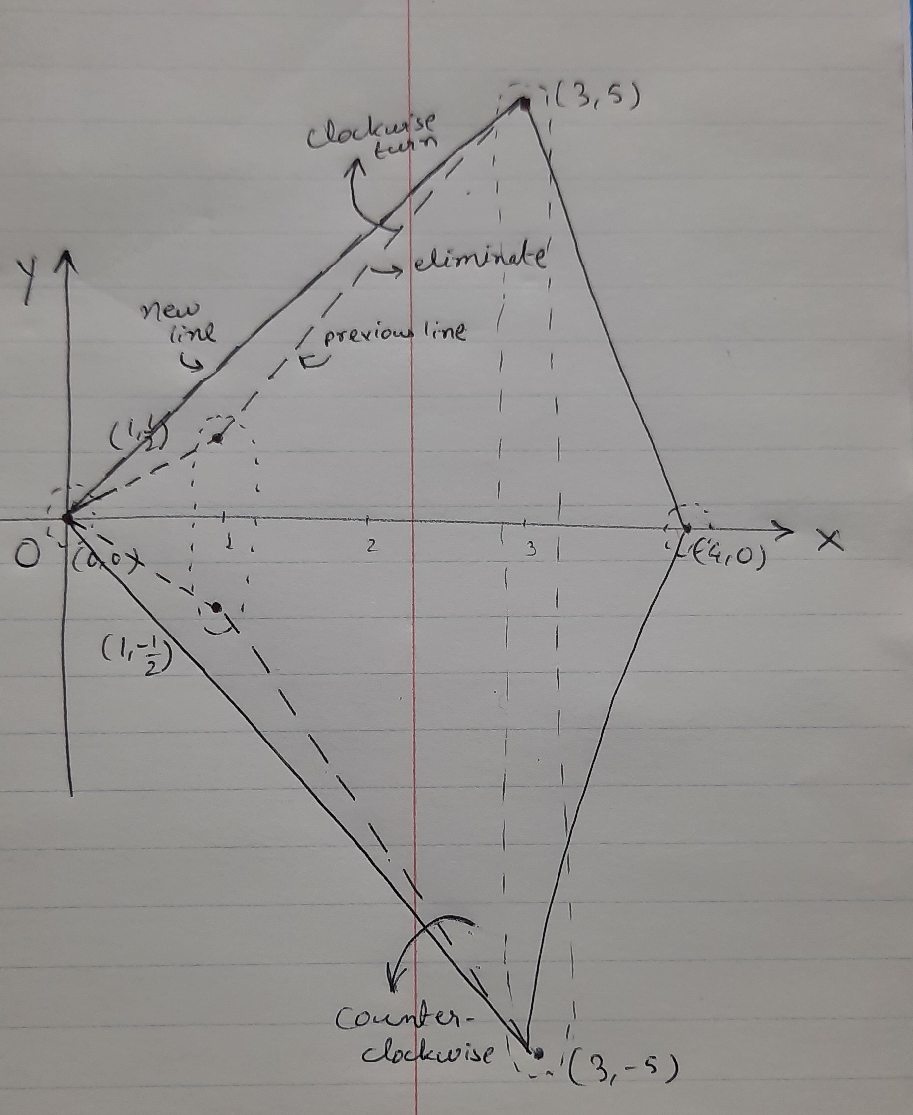 5. Now we need to connect these 2 triangles, the merging part. For that we will consider (3, 5) and (1, 1/2). The dot product of these 2 is positive and will move in a clockwise direction and connect to (0, 0).