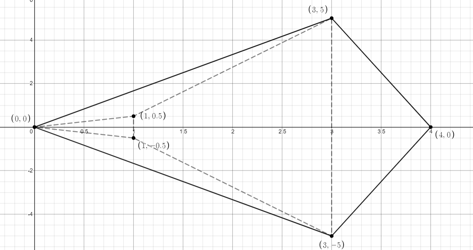 For our problem, the have to find the convex hull for the set of points (0,0),(1,12),(1,βˆ’12),(3,5),(3,βˆ’5),(4,0).
