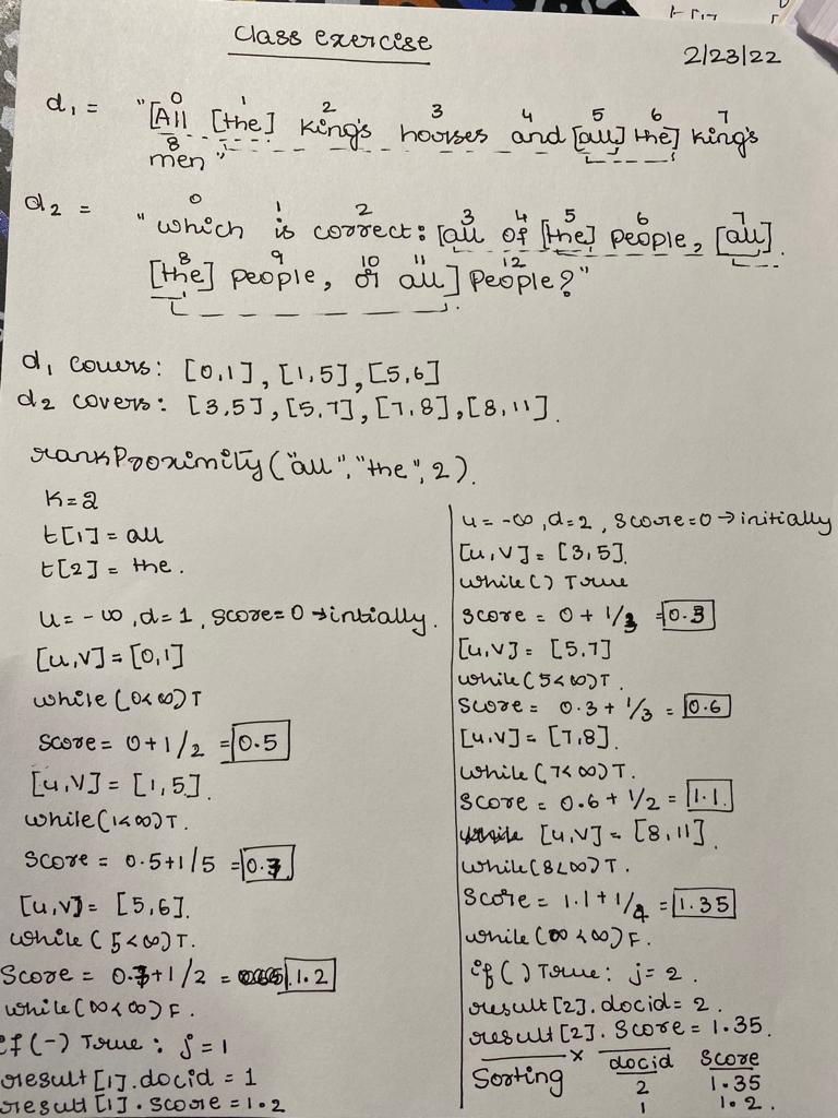 d1 = “All the king's horses and all the king's men" d2 = "Which is correct: all of the people, all the people, or all people?" rankProximity(“all”, “the”, 2) For document 1: [u,v] = [0,1], [1,5], [5,6] For document 2: [u,v] = [3,5], [5,7], [7,8], [8,11] j = 0, d = 1, score = 0 1st score = 0 + 0.5 = 0.5 2nd score = 0.5 + 0.2 = 0.7 3rd score = 0.7 + 0.5 = 1.2 result[1].docid = 1 result[1].score = 1.2 j = 1, d = 2, score = 0 1st score = 0 + 0.33 = 0.33 2nd score = 0.33 + 0.33 = 0.66 3rd score = 0.66 + 0.5 = 1.166 4th score = 1.166 + 0.25 = 1.416 result[2].docid = 2 result[2].score = 1.416 result = [{score = 1.416, doc_id=2},{score = 1.2, doc_id= 1}]