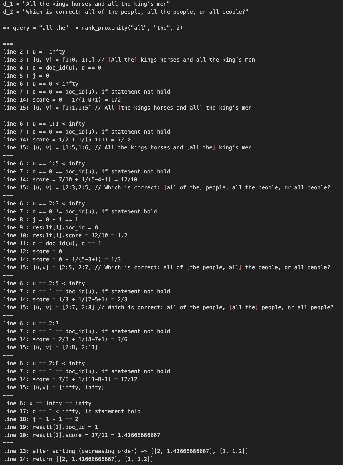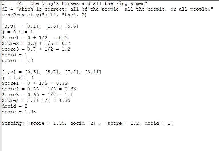 ''rankProximity(“all”, “the”, 2) Doc1: [u,v] = [0,1], [1,5], [5,6] Doc2: [u,v] = [3,5], [5,7], [7,8], [8,11] j = 0 d = 1 score = 0 Score = score + 1/ (v-u + 1) Score 1 = 0 + 1 / (1 - 0 + 1) = 0.5 , Score 2 = 0.5 + 1 / (5 - 1 + 1) = 0.7, Score 3 = 0.7 +1 / ( 6 - 5 + 1) = 1.2 result[1].docid = 1 , result[1].score = 1.2 j = 1 d = 2 score = 0 Score 1 = 0 + 1 / (5 - 3 + 1) = 0.3, Score 2 = 0.3 + 1 / (7 - 5 + 1) = 0.6, Score 3 = 0.6 + 1 / (8 - 7 + 1) = 1.1, Score 4 = 1.1+ 1 / (11 - 8 + 1) = 1.35 result[2].docid = 2 , result[2].score = 1.35 After sorting result by score: result = [[score = 1.35, doc_id =2] , [score = 1.2, doc_id = 1]]''