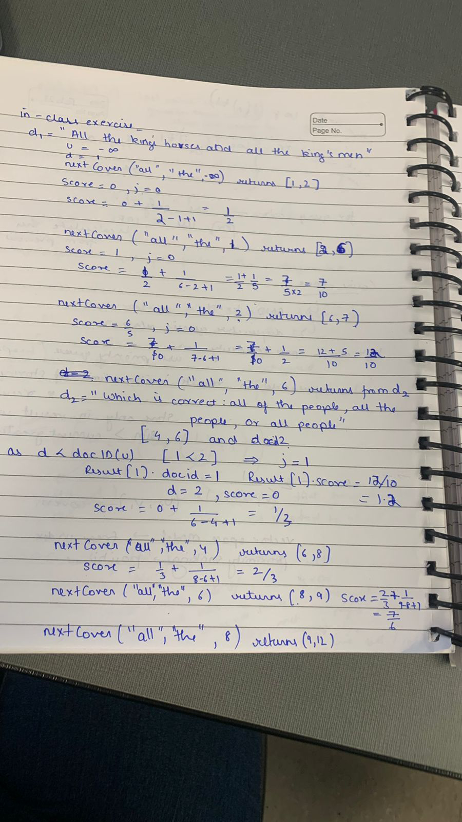 <pre> d1="All the king's horses and all the king's men" d2 = "Which is correct: all of the people, all the people, or all people?" rankProximity processing: '''Initially:''' u = -infinity nextCover("all", "the", -infinity) would give us [0:0,0:1] Thus, [u, v] = [0, 1] d = 0 score = 0 j = 0 '''Iterating through while loop:''' 1. docid(u) = 0, d = 0 score += 1/(1-0+1) = 1/2 nextCover("all", "the", 0) would give us [0:1,0:5] Thus, [u, v] = [1, 5] 2. docid(u) = 0, d = 0 score += 1/(5-1+1) = 1/2 + 1/5 = 7/10 nextCover("all", "the", 1) would give us [0:5,0:6] Thus, [u, v] = [3, 5] 3. docid(u) = 0, d = 0 score += 1/(6-5+1) = 7/10 + 1/2 = 6/5 = 1.2 nextCover("all", "the", 5) would give us [1:3,1:5] Thus, [u, v] = [3, 5] 4. docid(u) = 1, d = 0 From if condition (d<docid(u)): j = 1 Result[1].docid = 0 Result[1].score = 1.16 d = 1 score = 0 score += 1/(5-3+1) = 1/3 nextCover("all", "the", 3) would give us [1:5,1:7] Thus, [u, v] = [5, 7] 5. docid(u) = 1, d = 1 score += 1/(7-5+1) = 1/3 + 1/3 = 2/3 nextCover("all", "the", 7) would give us [1:7,1:8] Thus, [u, v] = [7, 8] 6. docid(u) = 1, d = 1 score += 1/(8-7+1) = 2/3 + 1/2 = 7/6 nextCover("all", "the", 7) would give us [1:8,1:11] Thus, [u, v] = [8, 11] 7. docid(u) = 1, d = 1 score += 1/(11-8+1) = 7/6 + 1/4 = 17/12 nextCover("all", "the", 8) would give us [infinity, infinity] Thus, [u, v] = [infinity, infinity] Exiting the while loop and checking the if condition (d<infinity), j = 2 Result[2].docid = 1 Result[2].score = 17/12 = 1.46 Sorting Result by score and returning top 2 documents: 1. {docid: 1, score: 1.46} 2. {docid: 0, score: 1.2} </pre>