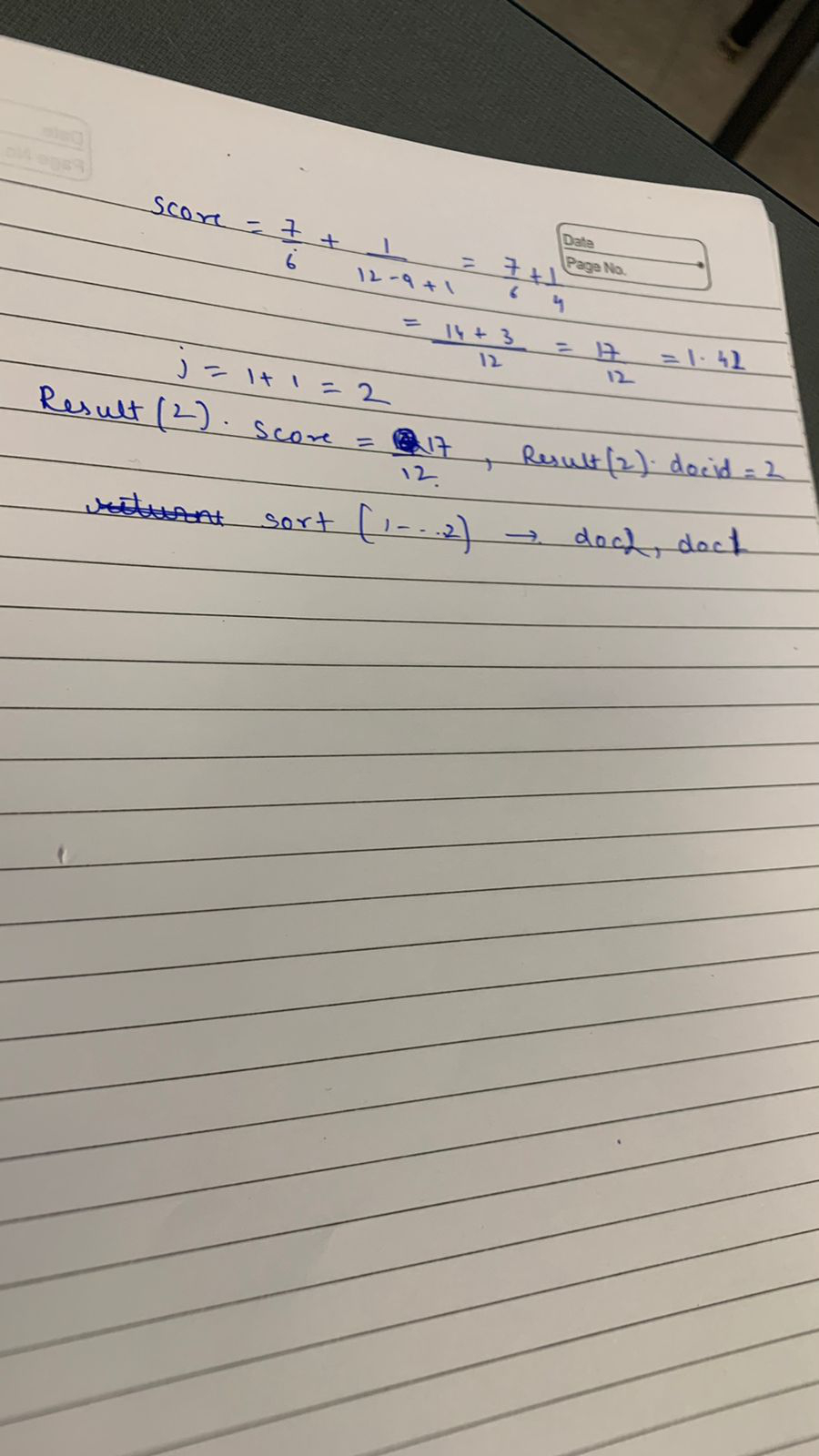 After sorting result by score: result = [[score = 1.35, doc_id =2] , [score = 1.2, doc_id = 1]]