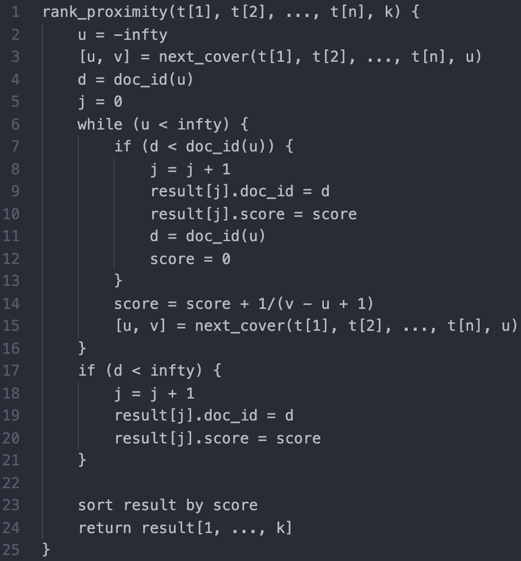 rankProximity(t[1],.., t[n], k) // t[] term vector = all, the // k = 2 { u := - infty; [u,v] := nextCover(t[1],.., t[n], u); // for d1 for the first round [0,1] d := docid(u); score := 0; j := 0; while( u < infty) do if(d < docid(u) ) then // if docid changes record info about last docid j := j + 1; // j = 1 Result[j].docid := d; Result[j].score := score; d := docid(u); score := 0; score := score + 1/(v - u + 1); // 0+1/(1-0+1 ) = 0.5 [u, v] := nextCover(t[1],.., t[n], u); // next cover [1,5] //… j = 2 //0+1/(5-1+1) = 0.2 //next cover [5,6] //j= 3 //0.3 +1/(6-5+1) = 0.5 //end of document //now second document //[3,5] //j =1 //0+1/(5-3+1)=0.33 //next cover [5,7] //j=2 //0+1/(7-5+1)=0.33 //next cover [7,8] //j=3 //0+1/(8-7+1)=0.5 //next cover[8,11] //j=4 //0+1/(11-8+1)= 0.25 //end of document if(d < infty) then // record last score if not recorded j := j + 1; //1 Result[j].docid := d;//docid = 1 Result[j].score := score; //score: 1.2 // second result : docid = 2, score = 1.41 sort Result[1..j] by score; return Result[1..k]; Results: 1. Docid:1, score: 1.2 2. Docid:2 score 1.41
