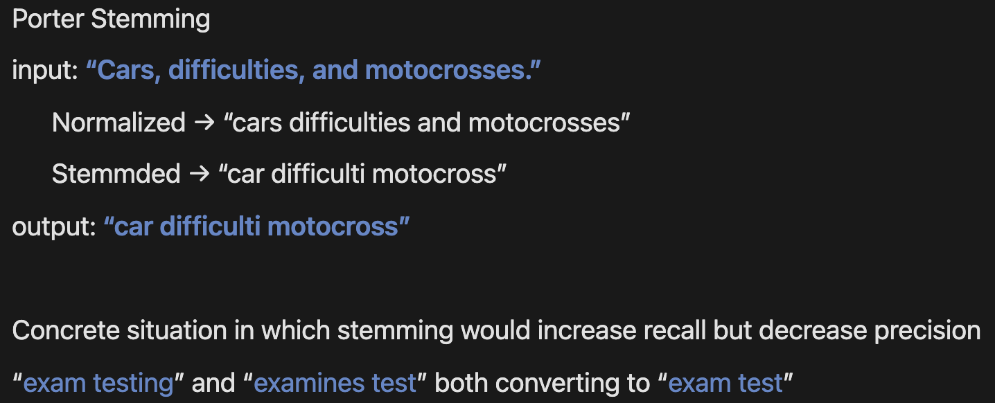 2. An example would calling would become call and if there were a document with calling, calls, callers, called it would all become call, making results grand, increasing recall, and decreasing precision.