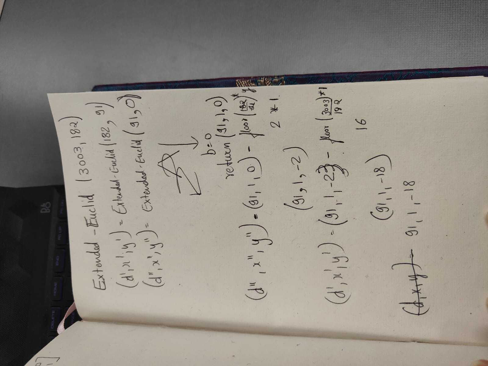 (d’, x’, y’) = Extended Euclid(182, 3003 mod 182) = Extended Euclid(182, 91)