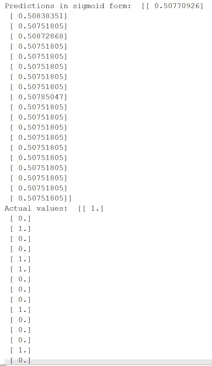 In the above result, 1 implies that the image belongs to the class being trained for and 0 implies that the image does not belong to the class. With 20 test images there are 6 1s in the above result and rounding off the sigmoid output gives 1 which implies that 30 percent of the time the model is correct.