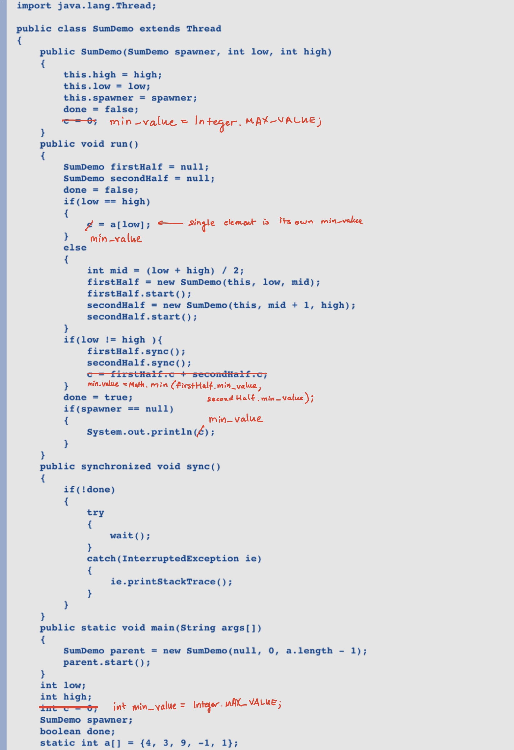 Make below change in run() : if(low != high ){ firstHalf.sync(); secondHalf.sync(); c = Math.min(firstHalf.c, secondHalf.c); //changed }