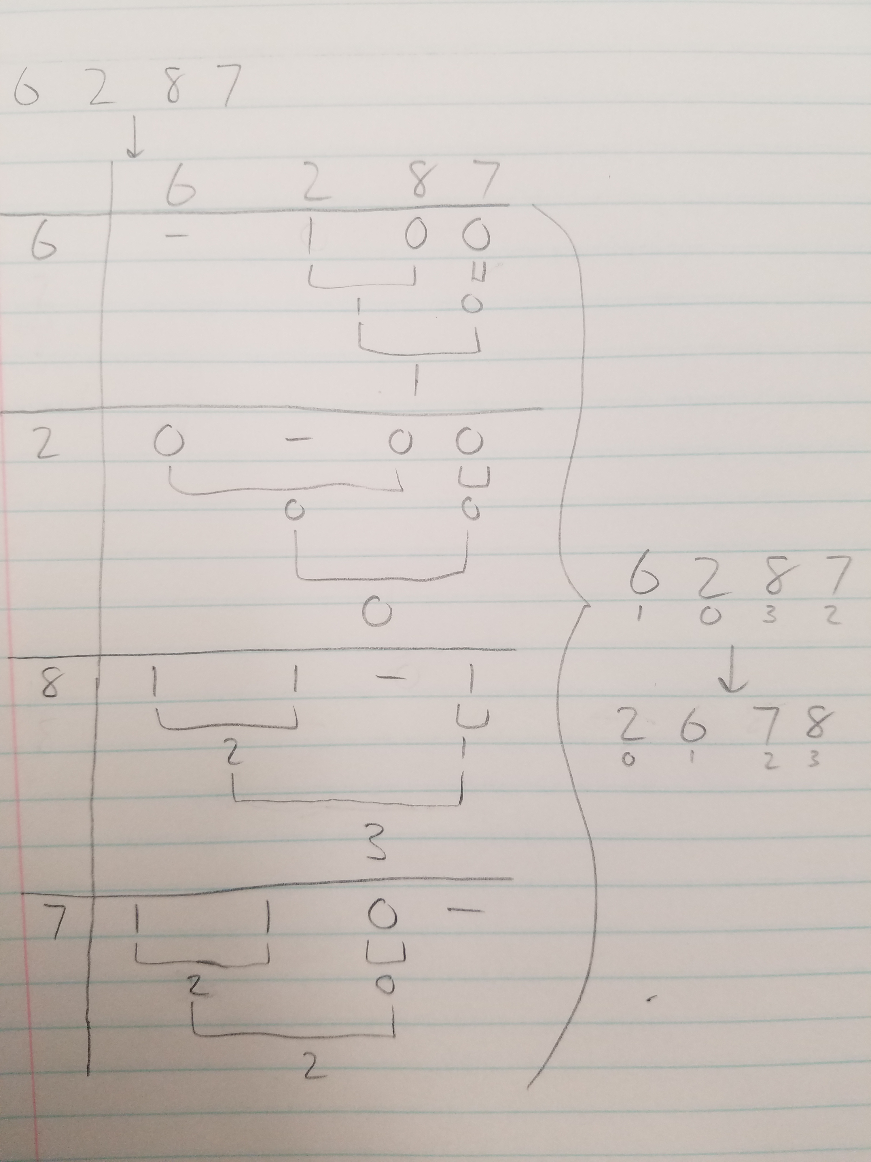 Use 3 processors for each element `i\in\{6, 2, 8, 7\}` to compare to the other elements. A total of 12 processors assign the following values, where each '1' represents being greater than some other element `j\in\{6, 2, 8, 7\}` where `j != i`. We sum the results from all the processors using a `\log`-sized tree in `O(\log n)` time.