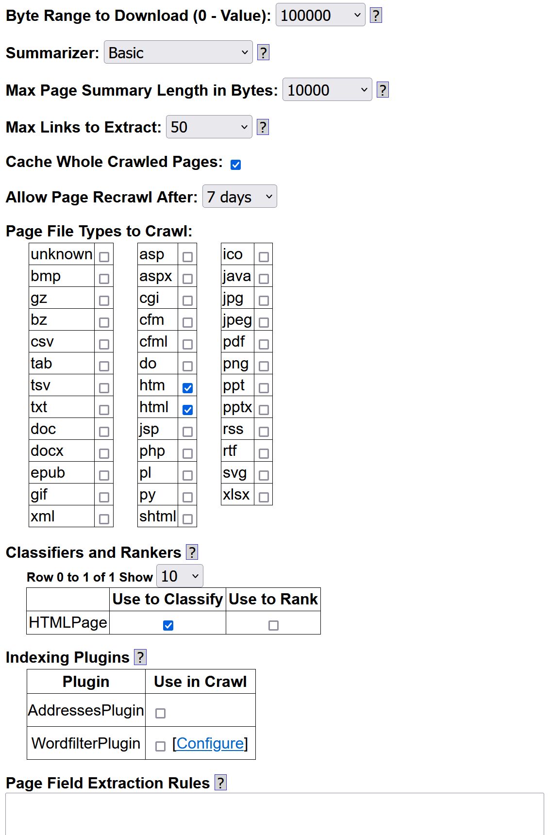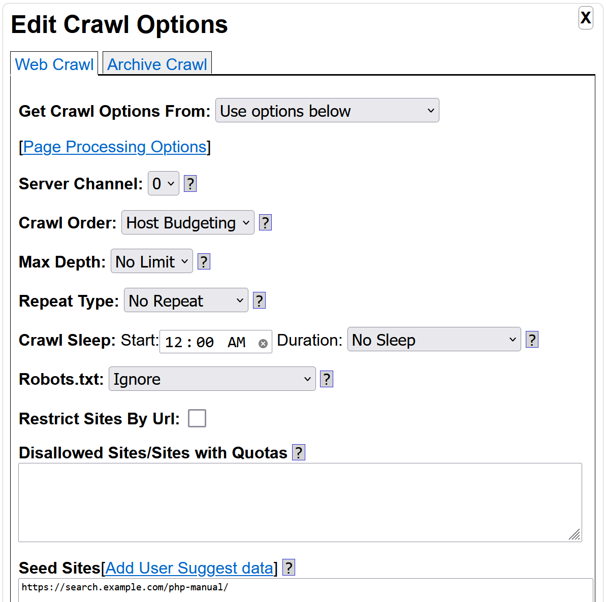 Yioop is dependent on curl, so as long as you have a modern copy of curl library installed, it should be HTTP/2 capable. I haven't added HTTP/3 support yet. You are starting your crawl from a http:// seed site, so if that page redirects to https:// you might get a redirect message. Again, that wouldn't explain why you are getting no search results. On the other hand, when I look at your page options, it looks like you have created a classifier that you are using to classify which web pages should be indexed. Did you try turning that off? Also, if you only check htm, html, it will only index web pages with that extension. So the page https://foo.com/ will not be indexed, because it does not have either extension, but https://foo.com/index.html would be indexed. The screening is done before any attempt at downloading the page, so at that point the mime type is not known. You can check unknown if you think it is okay to crawl https://foo.com/ . Also, I would tend to check at a minimum .txt as well.